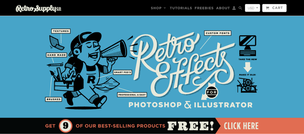 Ретро поставка это интернет-магазин, который продает цифровые активы для графических дизайнеров и иллюстраторов, вдохновленных историей. Основатель компании Дастин Ли, дизайнер по профессии, перешел от создания независимого магазина веб-дизайна к получению более пассивного дохода за счет выбора цифровых продуктов Retro Supply.