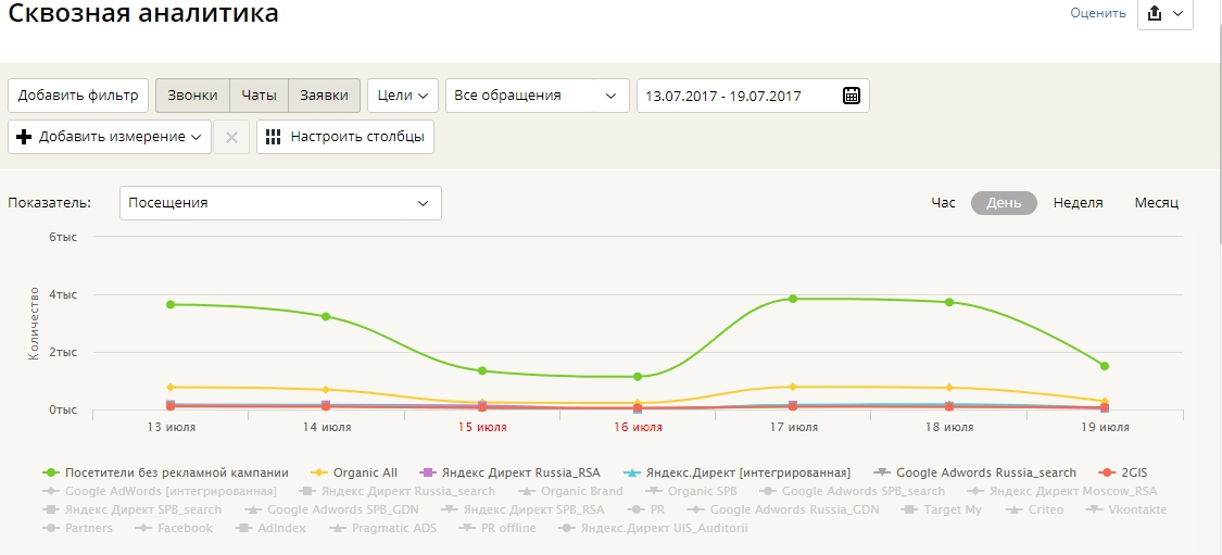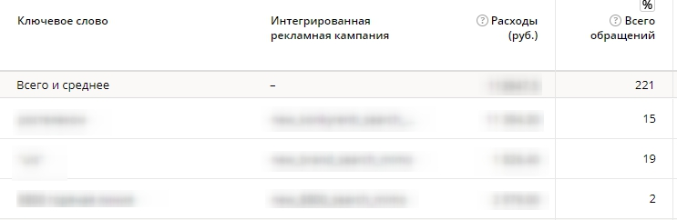 У звітах "Аналіз трафіку" і "Наскрізна аналітика" тепер можна побачити консолідовані дані по налаштованим в Яндекс.Директі рекламним кампаніям: число переходів на сайт компанії, середній час сесій відвідувачів, відсоток конверсії в цільові дії і звернення (дзвінки, чати, заявки) , в тому числі, в якісні і не якісні, і т.п. Причому подивитися цю інформацію можна як по самим кампаніям, так і для кожного ключового слова або групи запитів.