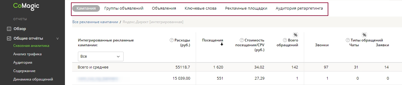 Інтеграція з Яндекс.Директ дозволить не тільки автоматично підтягнути в CoMagic витрати на рекламу, але ще і дозволяє перенести всю структуру рекламних кампаній аж до ключових слів, що робить роботу з даними максимально зручною із зануренням до потрібного рівня даних.