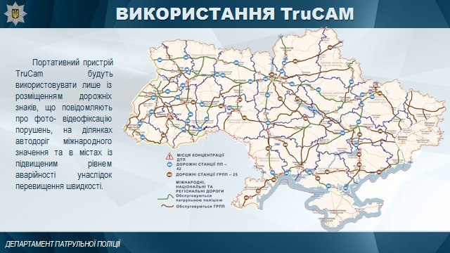 Екіпажі патрульної поліції будуть використовувати знову підготовлені до роботи вимірювачі TruCam, які почали видавати в кінці вересня . Обладнання успішно пройшло українські випробування ще в 2010 році і застосовувалося на дорогах до 2013 року, а тепер знову надійшло на забезпечення патрульної поліції. Варто відзначити, що TruCam - це лазерний вимірювач швидкості, а не радіолокаційний. У приладу більш вузький промінь, який практично зводить до нуля захоплення сусіднього автомобіля, що не приводить до помилок, властивим сумнозвісному Візиру. TruCam також здатний автоматично фіксувати порушення швидкісного режиму навіть без участі інспектора.