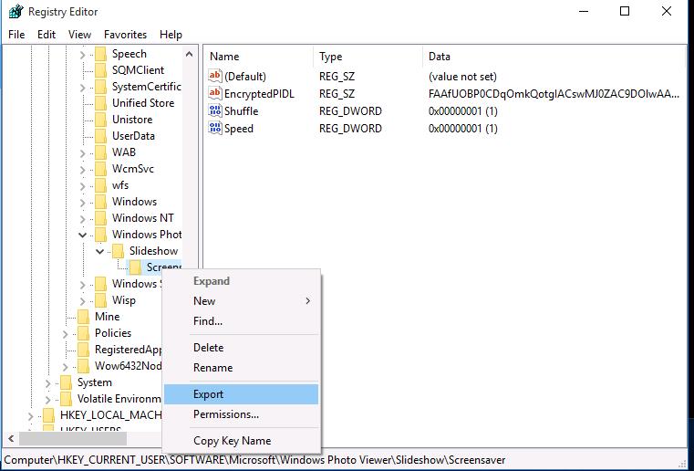 Тепер нам потрібно експортувати гілку реєстру HKEY_ CURRENT_ USER> Software> Microsoft> Windows Photo Viewer> Slideshow> Screensaver в reg файл і імпортувати її на контролері домену (або іншому комп'ютері, з якого виконується редагування GPO).