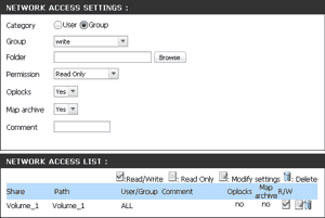 Основні параметри, які потрібні звичайному користувачеві, знаходяться на вкладці NETWORK ACCESS. Тут ми вибираємо користувача або групу користувачів (задати імена користувачів і групувати їх можна, відповідно, в меню USERS / GROUPS), далі, натиснувши кнопку BROWSE, створюємо і вибираємо папку, до якої потрібно надати доступ, вибираємо дозвіл (тільки читання або читання і запис). Два наступних параметра залишимо просунутим користувачам. В останньому полі можна задати коментар. ВСЕ ГОТОВО, тисну Save Settings.