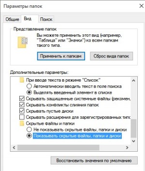 Далі переходимо у вкладку вид, прокручуємо вниз і вибираємо «Показувати приховані файли, папки і диски».